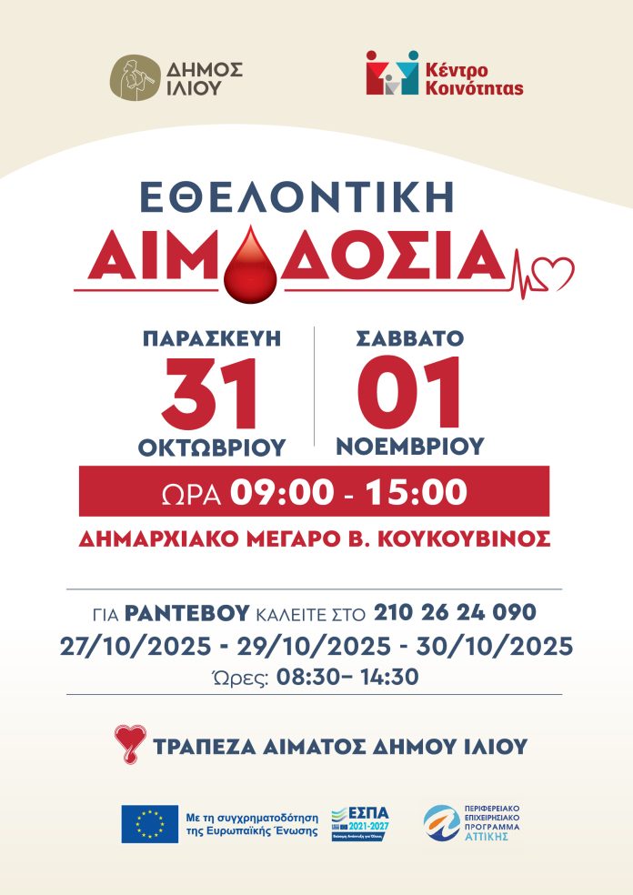 Ο Δήμος Ιλίου διοργανώνει Εθελοντική Αιμοδοσία την Παρασκευή 31 Οκτωβρίου 2025 και το Σάββατο 1 Νοεμβρίου 2025 από 9:00 – 15:00 στο Δημαρχιακό Μέγαρο Ιλίου «Β. Κουκουβίνος» (Αίθουσα Πολλαπλών Χρήσεων), Κάλχου 48-50.