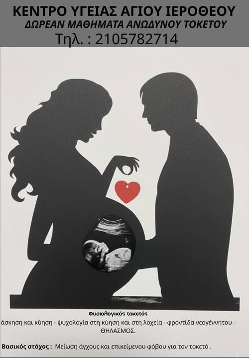 Το ΚΕΠ Υγείας του Δήμου Περιστερίου ενημερώνει ότι στο Κέντρο Υγείας Αγίου Ιεροθέου πραγματοποιούνται δωρεάν μαθήματα ανώδυνου τοκετού, με στόχο τη σωστή προετοιμασία των εγκύων κατά την κύηση και τη λοχεία.