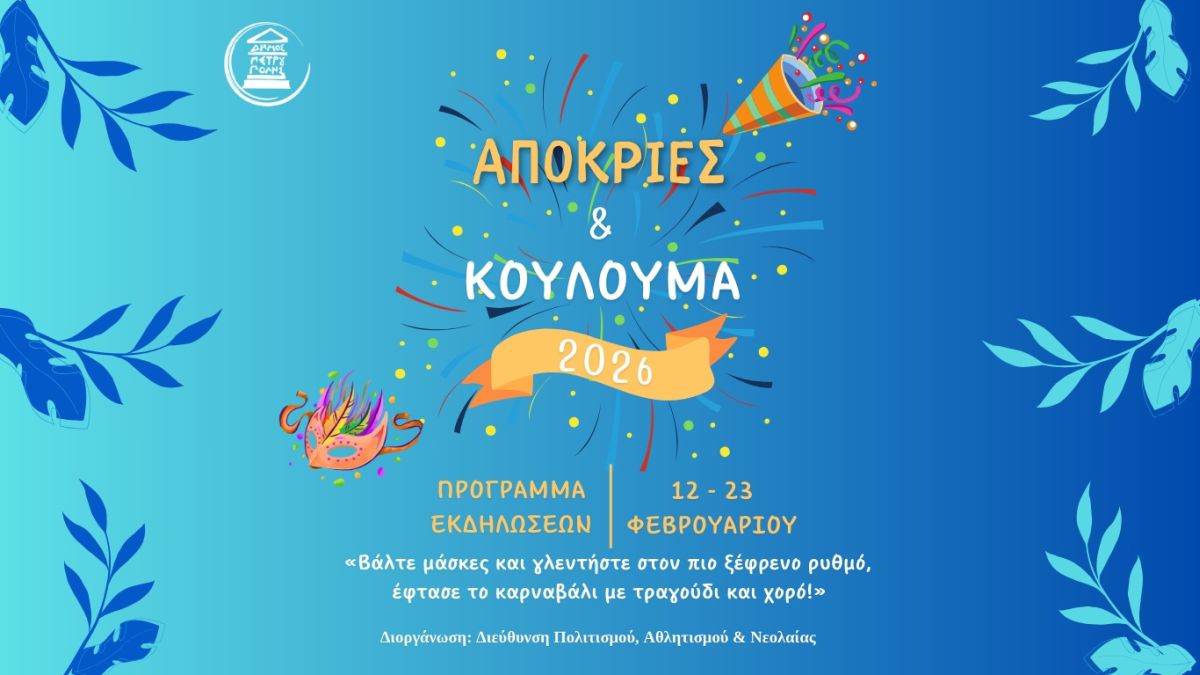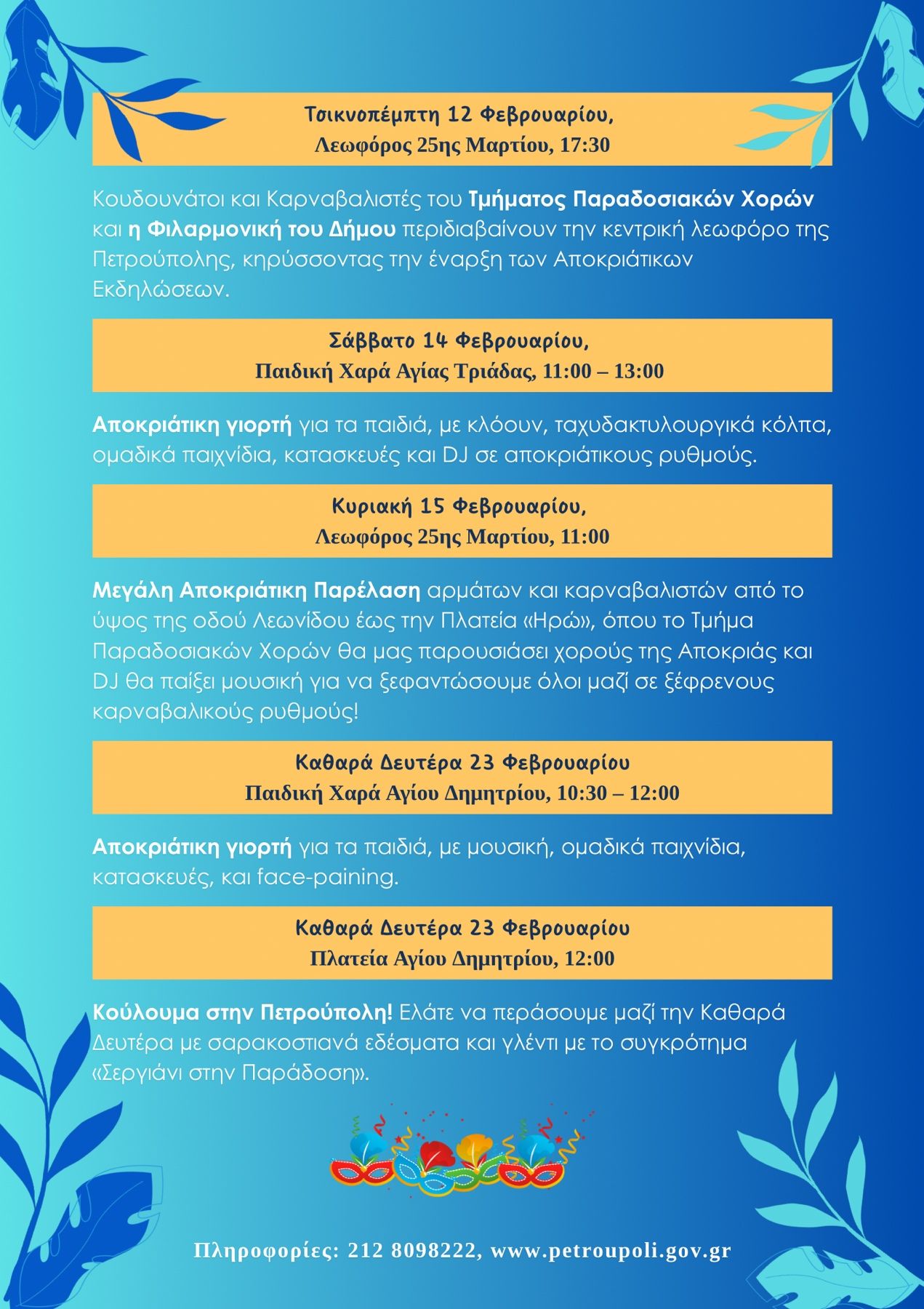 Ο Δήμος Πετρούπολης σας καλεί στις εκδηλώσεις για τον εορτασμό της Αποκριάς και της Καθαράς Δευτέρας.