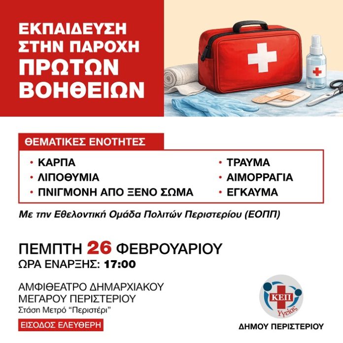 Το ΚΕΠ Υγείας Δήμου Περιστερίου, σε συνεργασία με την Εθελοντική Ομάδα Πολιτών Περιστερίου (ΕΟΠΠ), διοργανώνει εκπαιδευτική δράση στην παροχή Πρώτων Βοηθειών, με στόχο την ενημέρωση και την πρακτική εκπαίδευση των πολιτών σε κρίσιμες καταστάσεις έκτακτης ανάγκης.