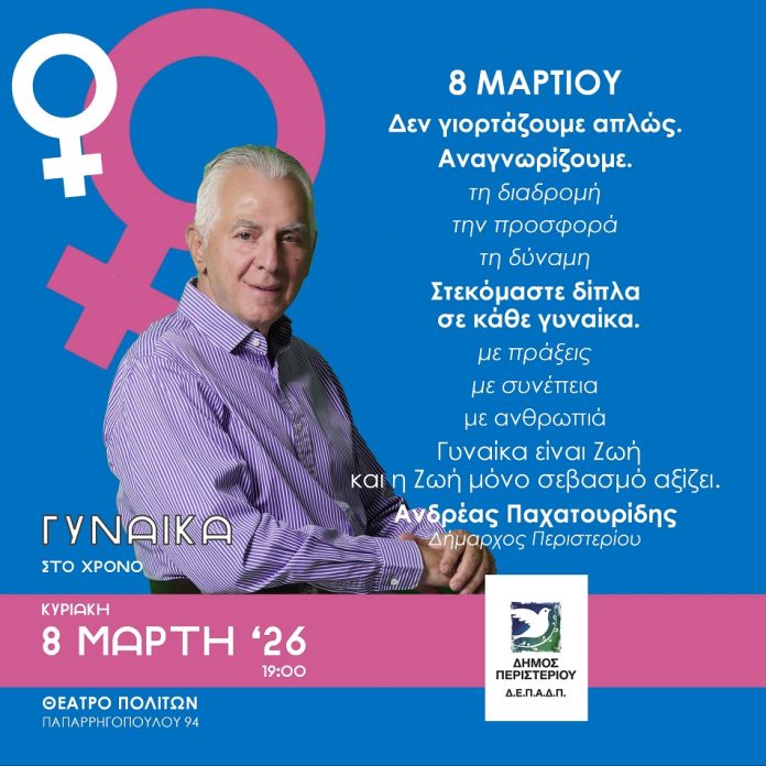 Με αφορμή την 8η Μαρτίου, ο Δήμαρχος Περιστερίου Ανδρέας Π. Παχατουρίδης, επισημαίνει: «Δεν γιορτάζουμε απλώς. Αναγνωρίζουμε τη διαδρομή, την προσφορά και τη δύναμη. Στεκόμαστε δίπλα σε κάθε γυναίκα με πράξεις, με συνέπεια και με ανθρωπιά. Γυναίκα είναι Ζωή και η Ζωή μόνο σεβασμό αξίζει».