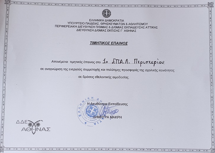 Στην ημερίδα παρευρέθηκαν ο Διευθυντής του σχολείου μας κ Δροσάτος Αναστάσιος , ο υπεύθυνος για την Εθελοντική Αιμοδοσία εκπαιδευτικός κ. Δανελάτος Γεράσιμος, μαζί με μαθητές/τριες ,οι οποίοι και παρέλαβαν τον τιμητικό έπαινο .